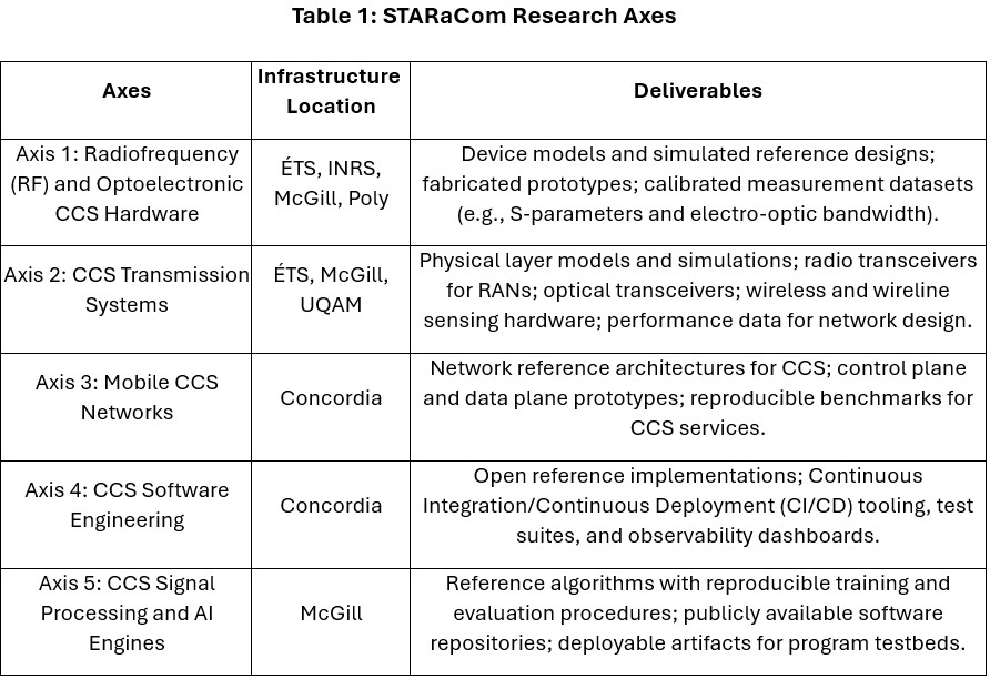 The insatiable demand for and emergence of new functionalities that will drive advancements in, for example, 6G RANs, IoT, Healthcare, and Smart Cities, are dependent upon solving significant research challenges in communicating, computing and sensing (CCS). To achieve this, STARaCom brings together 5 research axes, unparalleled interdisciplinary expertise, targeted portfolio programming, and access to state-of-the-art infrastructure and industry and end users to achieve its deliverables (Table 1). Via this axis structure, our medium-term vision is to develop new CCS enabled products and services delivered to individuals and communities in Québec who are navigating the AI era.